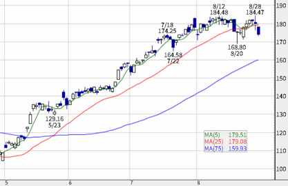 金曜は3%安、184.5弱で小さく土ブルトップを付けた感あり。